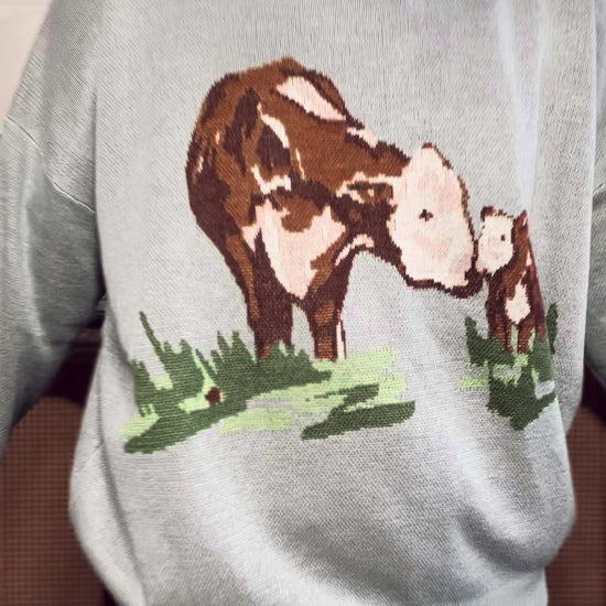 the dusty blue body of this knit is ON POINT.... like the color is goood. & we couldn't resist adding a cow calf pair graphic.